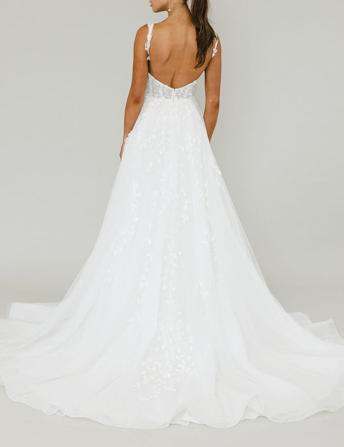 Thin strap tulle a-line dress with 3d leaf appliqués and clear beaded bodice