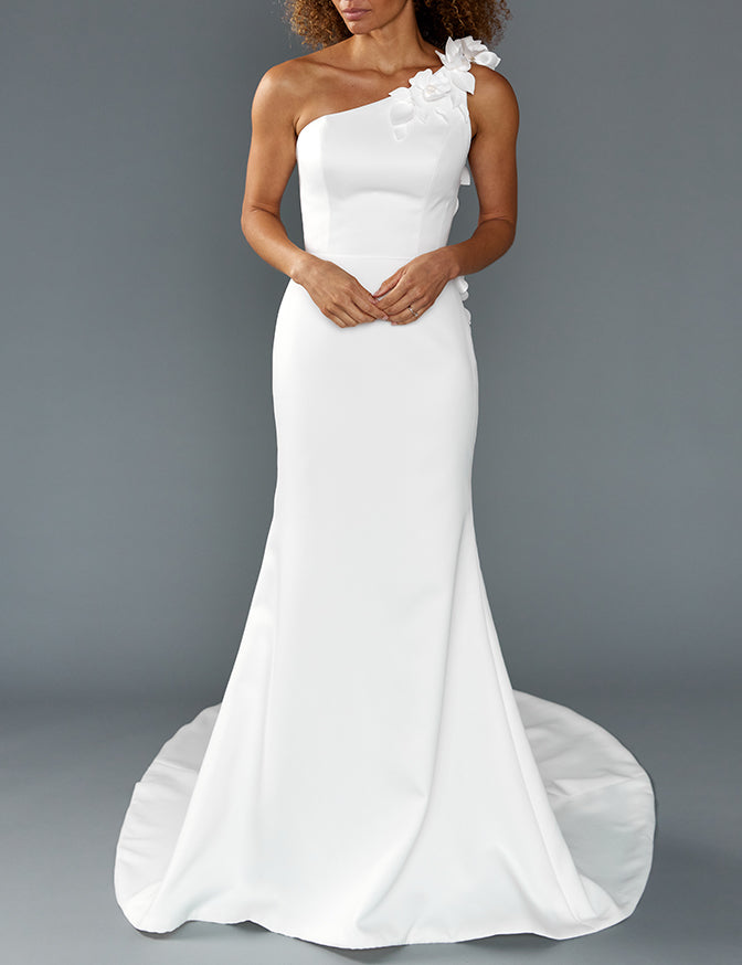 One shoulder matte satin dress with 3d floral appliqués cascading over the shoulder