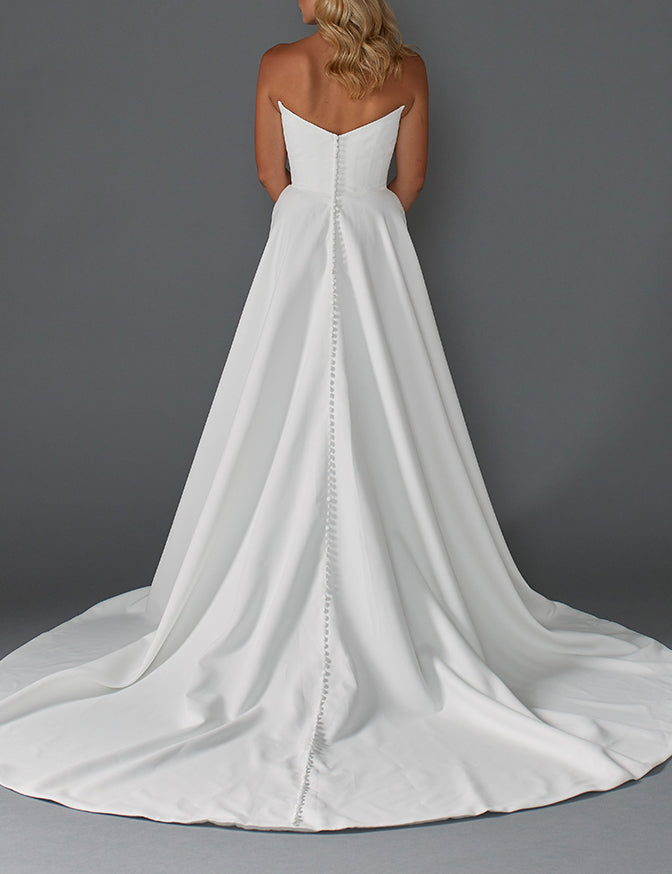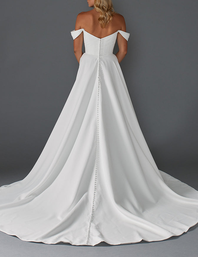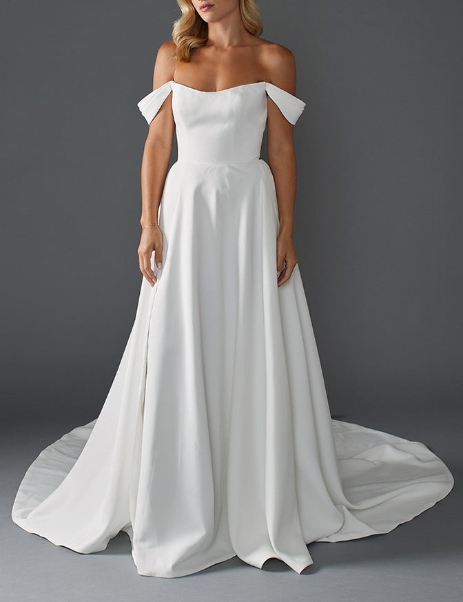 Simple matte satin a line dress with detachable off shoulder cap sleeves and slit