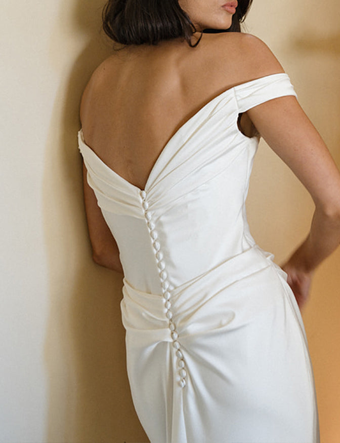 Off the shoulder satin dress with draped skirt and functional button closure
