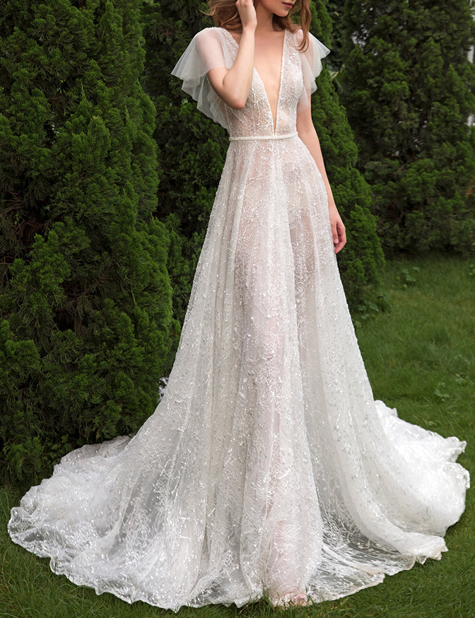 Flutter sleeve unlined Chantilly lace dress with silver sequin and plunging V neck
