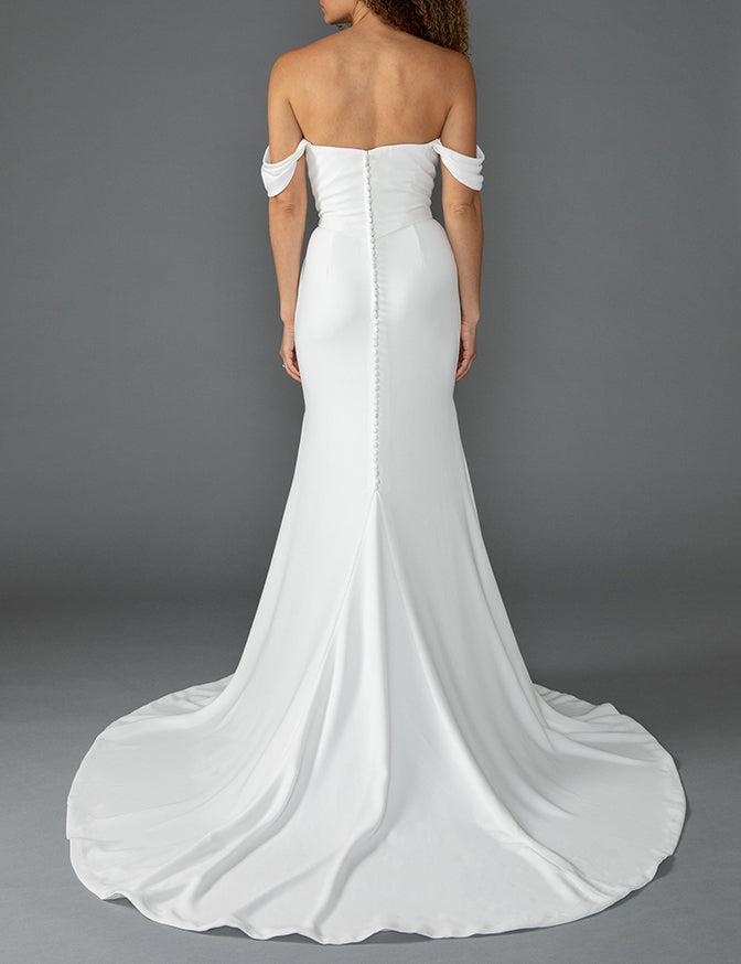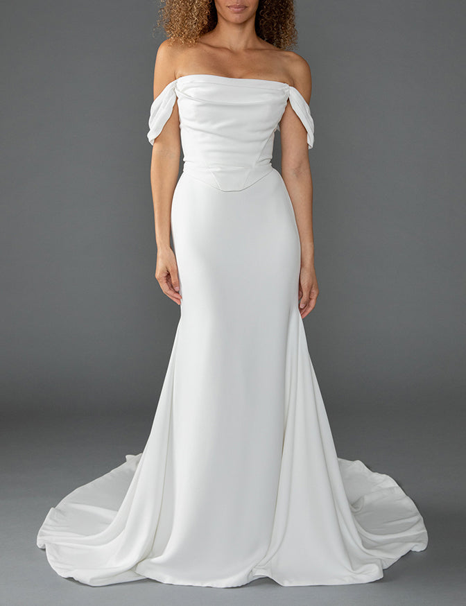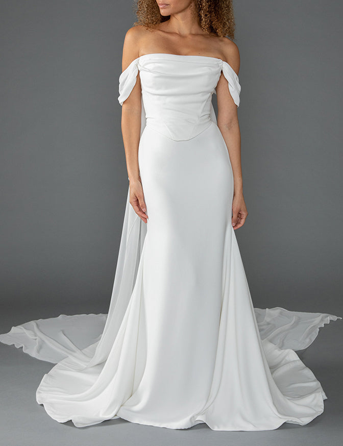 A fitted off the shoulder crepe gown with detachable chiffon cape