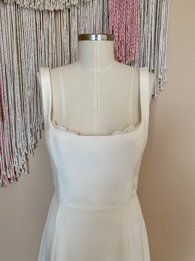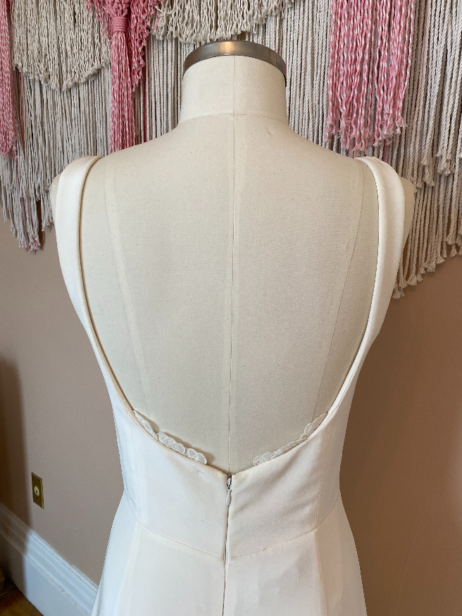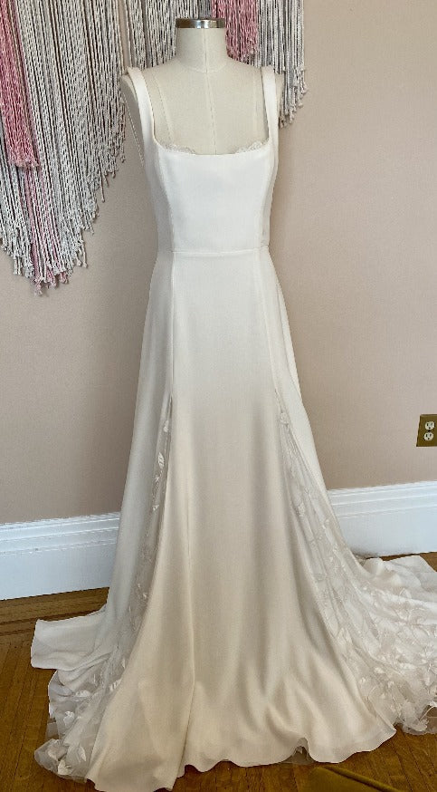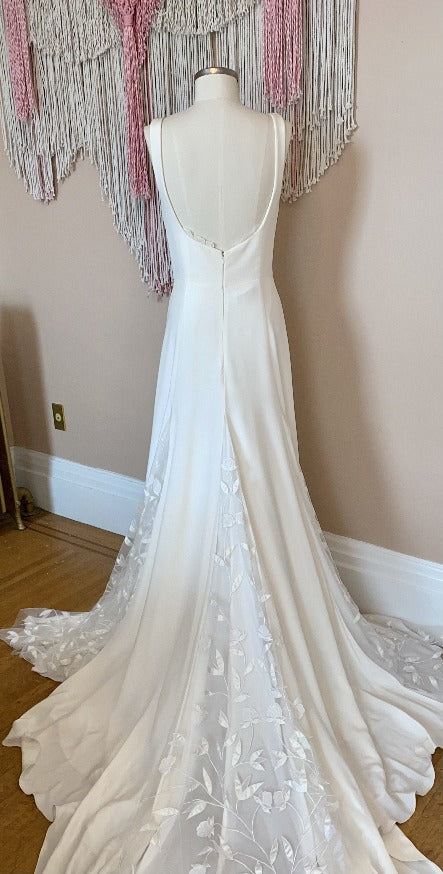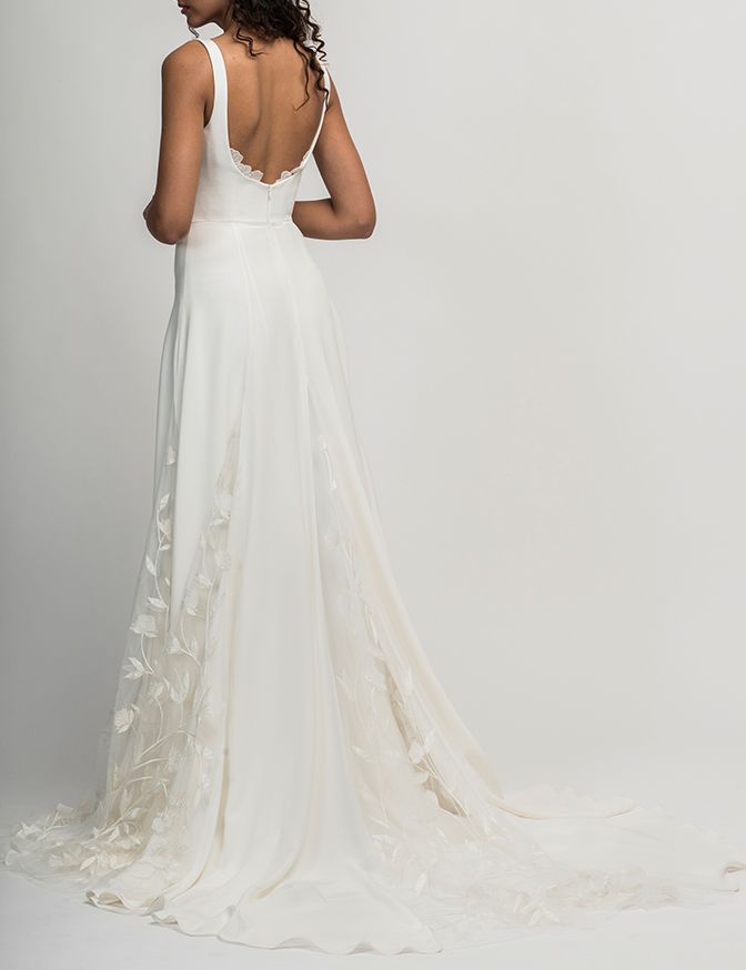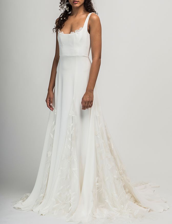 Romantic, silk crepe A-line style is perfectly balanced by hand-embroidered floral appliqué panels in the skirt. The modern, wide scoop neckline is softened by floral petals peeking out from the neck and backline to create a gown with both clean lines and feminine details.