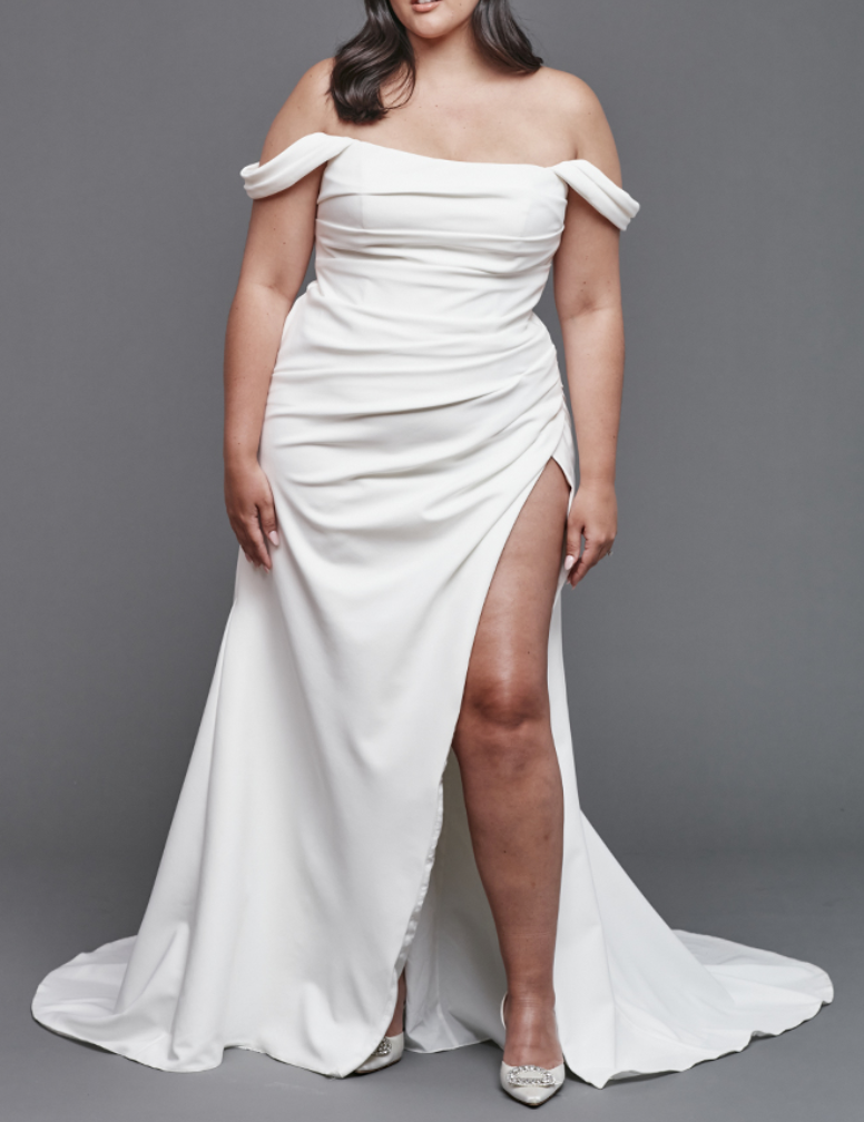 A fitted crepe gown with ruching throughout, continued onto the back, removable straps, and a slit