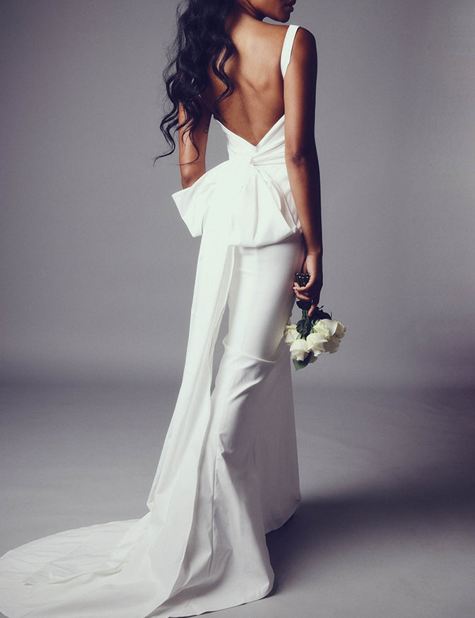 A structured crepe gown with v neck, low back, and bow tie detail