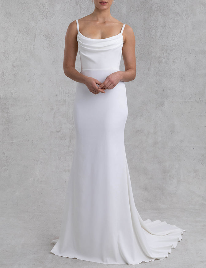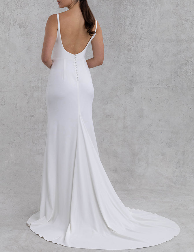 Zoe is a classic fitted gown in our stretch crepe fabrication. Featuring a structured bodice with a wide scoop neckline and draped detailing, as well as a beautiful low back.